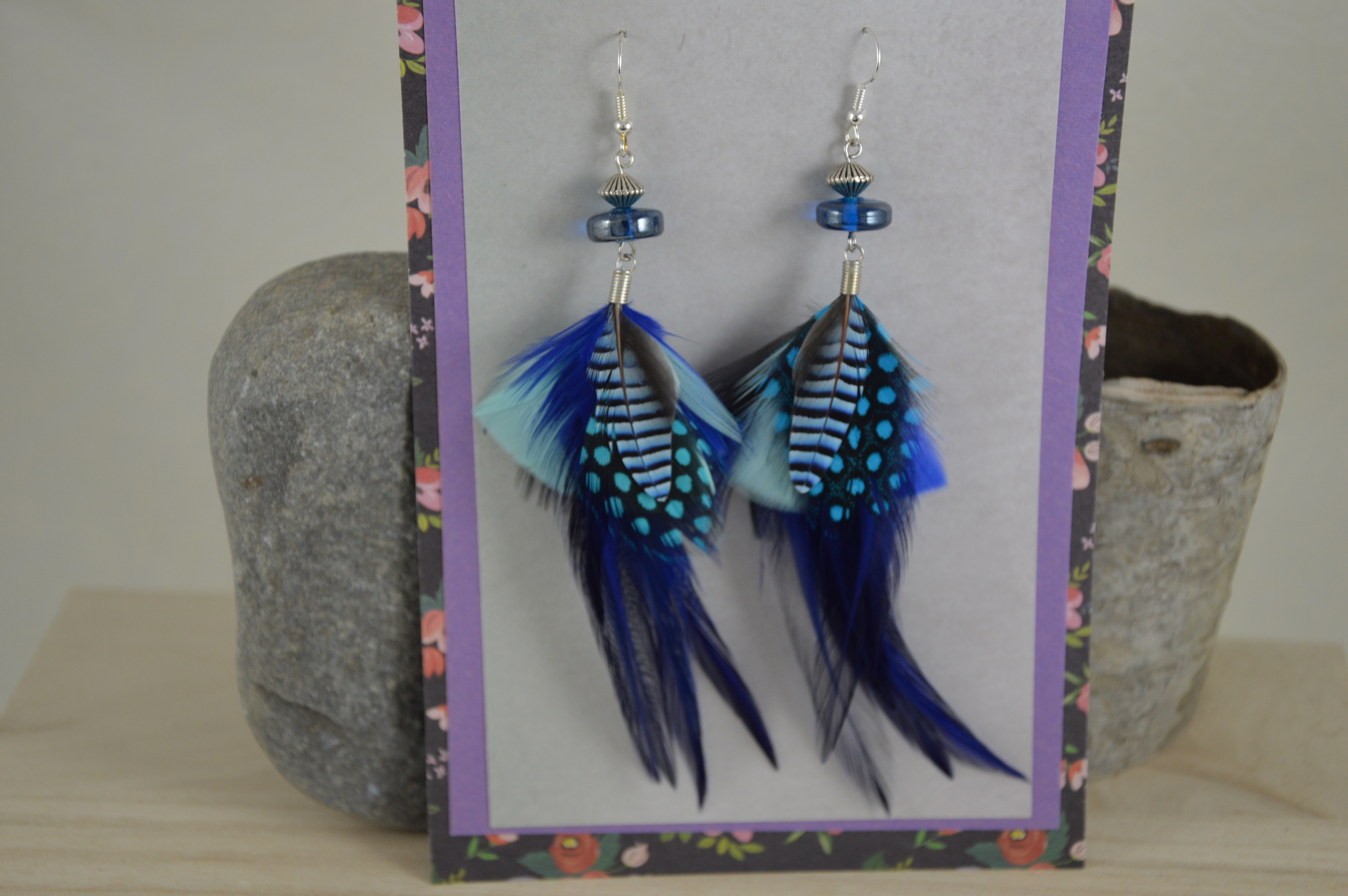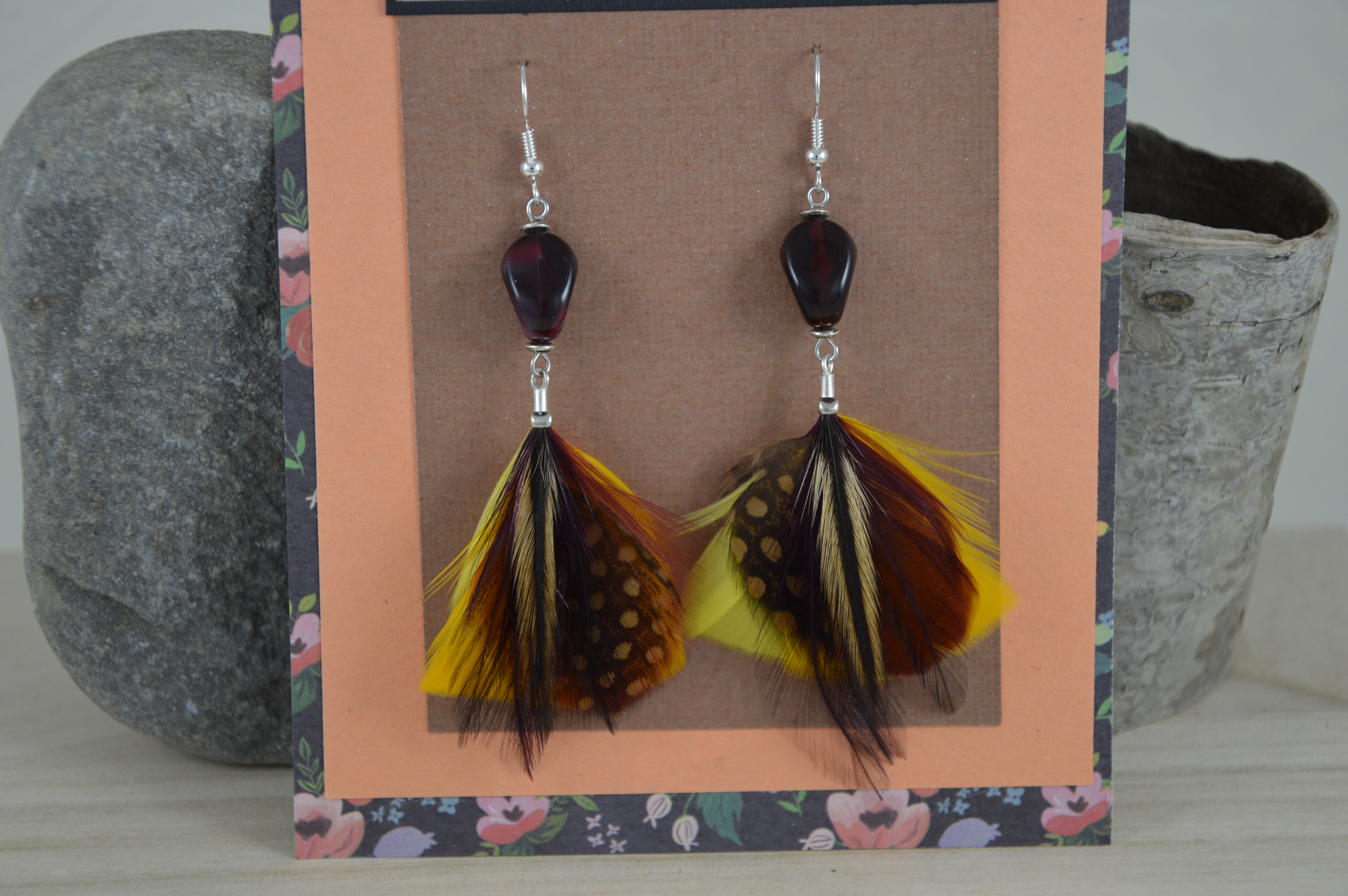 Boucles d'oreilles à plumes. création unique fait de plumes naturelles, de pierres et de perles. Peut se séparées en deux boucles d'oreilles.